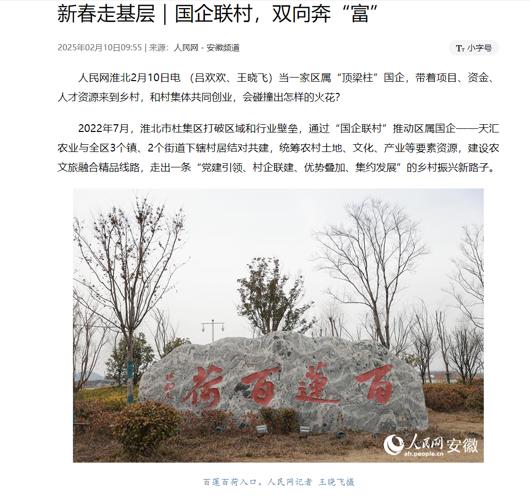 12 02月2025 了解詳情 天匯農(nóng)業(yè):新春受贊,新年連獲佳績(jī) 在杜集區(qū)的鄉(xiāng)村振興實(shí)踐中,在集團(tuán)公司的戰(zhàn)略引領(lǐng)與資源支持下,與鄉(xiāng)村緊密攜手,天匯農(nóng)業(yè)與全區(qū)3個(gè)鎮(zhèn)、2個(gè)街道下轄村居結(jié)對(duì)共建,統(tǒng)籌農(nóng)村土地、文化、產(chǎn)業(yè)等要素資源,建設(shè)農(nóng)文旅融合精品線(xiàn)路,走出了一條獨(dú)具特色的發(fā)展之路, 近日,人民網(wǎng)在新春走基層系列報(bào)道中,聚焦淮北市杜集區(qū)的“國(guó)企聯(lián)村”模式,對(duì)淮北市天匯農(nóng)業(yè)發(fā)展有限公司進(jìn)行了重點(diǎn)報(bào)道。